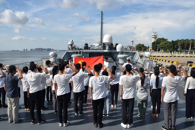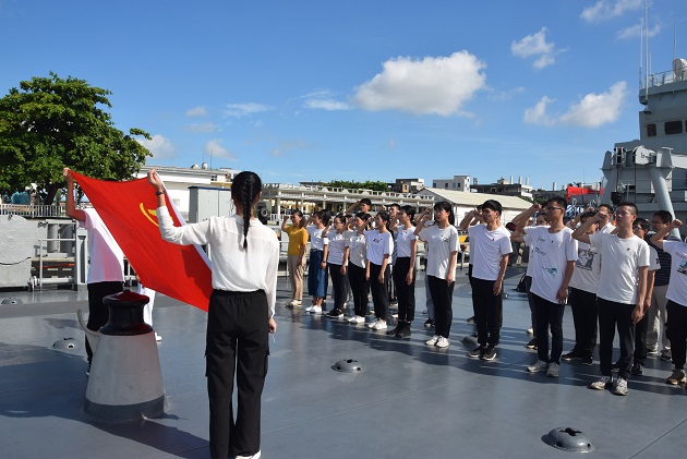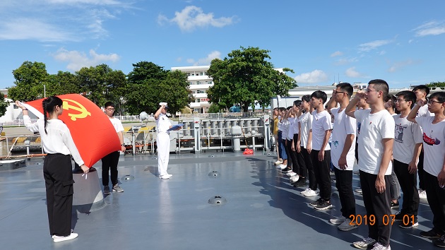 在991舰甲板上,蓝天白云和艳阳烈日下,该舰教导员朱开棣带领师生共同重温了入党誓词,表达了矢志不渝守初心,奋发有为担使命的决心和信念。