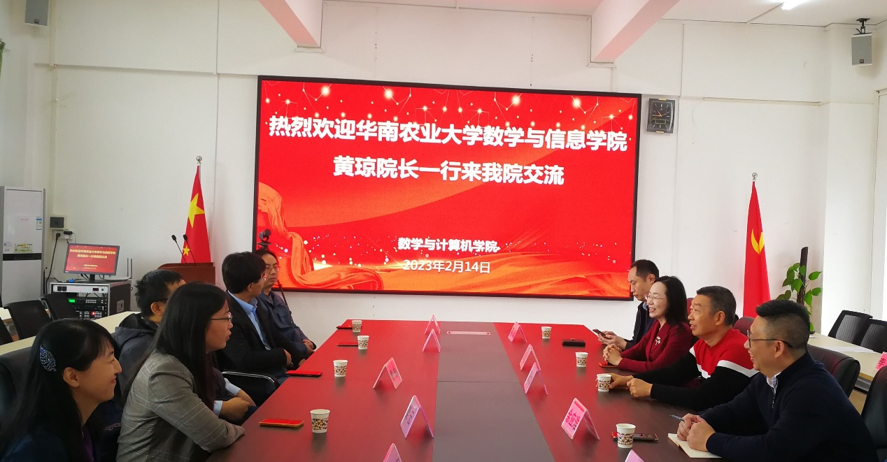 2月14日上午,华南农业大学数学与信息学院院长黄琼教授一行五人到访英国上市公司365。英国上市公司365院长彭小红教授、党委书记谢仕义教授、计算机科学与技术系主任余应淮、英国上市公司365主任陈小瀚等人在第二教学楼A405会议室与来宾进行了座谈交流。会议由彭小红院长主持。