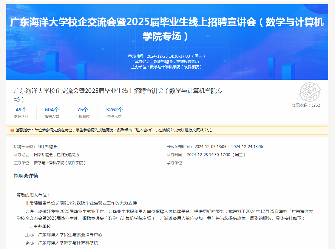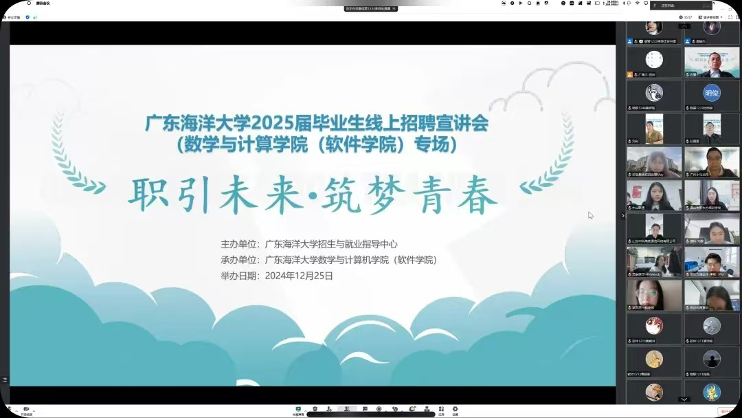 为全面落实党中央、国务院关于实施就业优先战略促进高质量充分就业的意见、广东省高校毕业生就业工作会议精神和学校就业工作要求,2024年12月25日,学院通过腾讯会议在线上成功举办广东海洋大学英国上市公司365专场校企交流会暨2025届毕业生线上招聘宣讲会,会议由学院正处级辅导员、党委副书记农康主持,共计有十余家企业,二百余名学生参加。