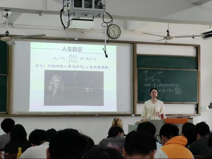 课堂上,梅端老师带来《数值分析》课程的精彩讲授。课堂伊始,梅老师先回顾“根的隔离与二分法”,以此为切入点自然地引入核心内容—牛顿迭代法。在讲解过程中,梅老师不仅对牛顿迭代法进行细致剖析,通过公式推导、案例演示等方式,让抽象的数值分析知识变得通俗易懂。同时,巧妙融入“课程思政”元素,以牛顿迭代法中“不断逼近目标值” 的原理为切入点,引导学生对人生方向、努力过程与目标达成展开思考。