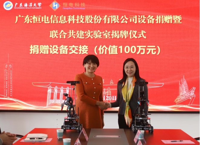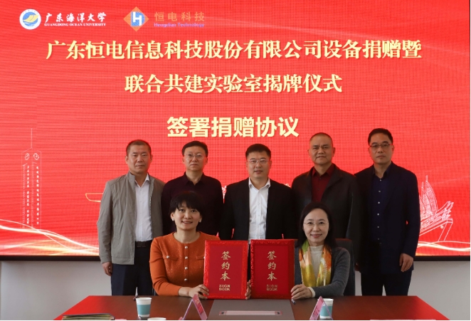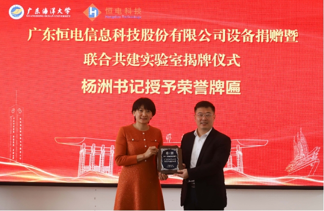 随后,为表彰企业的公益贡献,杨洲书记代表学校向广东恒电信息科技股份有限公司授予了“广东海洋大学教育卓越贡献奖”荣誉牌匾。