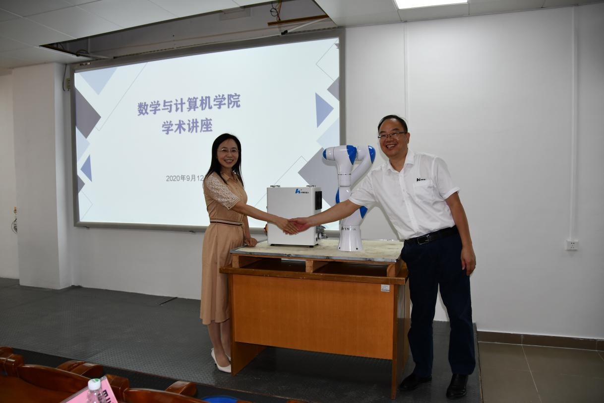 在座谈交流前,英国上市公司365领导陪同来访嘉宾参观了学院大学生创新创业实践基地,并在湖光校区第二教学楼A座103报告厅举行了一个交接仪式:华数公司为支持英国上市公司365教学科研和学生创新培养,支援学院一台价值15万元的智能机器人。在交接仪式上,杨海滨总经理介绍,支援这台款式最新、技术最先进的机器人到数计学院,源于机器人的硬件和软件由海大校友邓旭高和黄键带领团队研发而成,亲自带他们回到学校,希望这台机器人对学院人才培养能发挥鼓舞和激励作用。彭小红院长代表学院对杨总一行表示衷心感谢,她表示,学院将充分利用好这台智能机器人,大力开展教育教学和科学研究,切实加强创新人才培养,为地方经济建设输送更多优质人才。