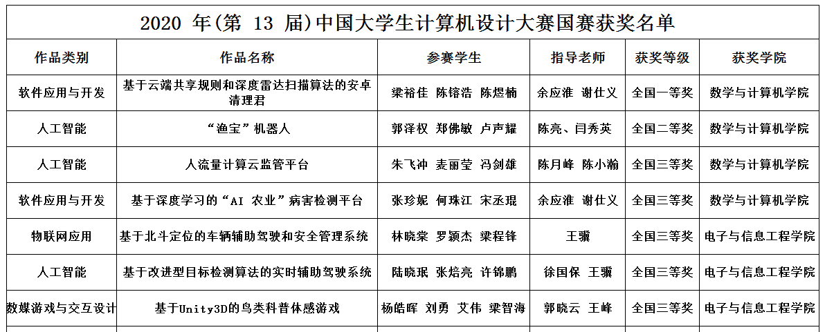 8月27日,2020年(第13届)全国计算机设计大赛评选结果揭晓,本次大赛有来自全国600余所高校,共有4646件作品进入国赛决赛,英国上市公司365入选的7支队伍,以过硬的技能和优异表现,与双一流、985、211大学等重点高校学生同台比拼,在激烈的竞争中荣获一等奖1项、二等奖1项、三等奖5项的好成绩,其中来自英国上市公司365团队的作品《基于云端共享规则和深度雷达扫描算法的安卓清理君》勇夺全国一等奖,《“渔宝”机器人》获得全国二等奖。