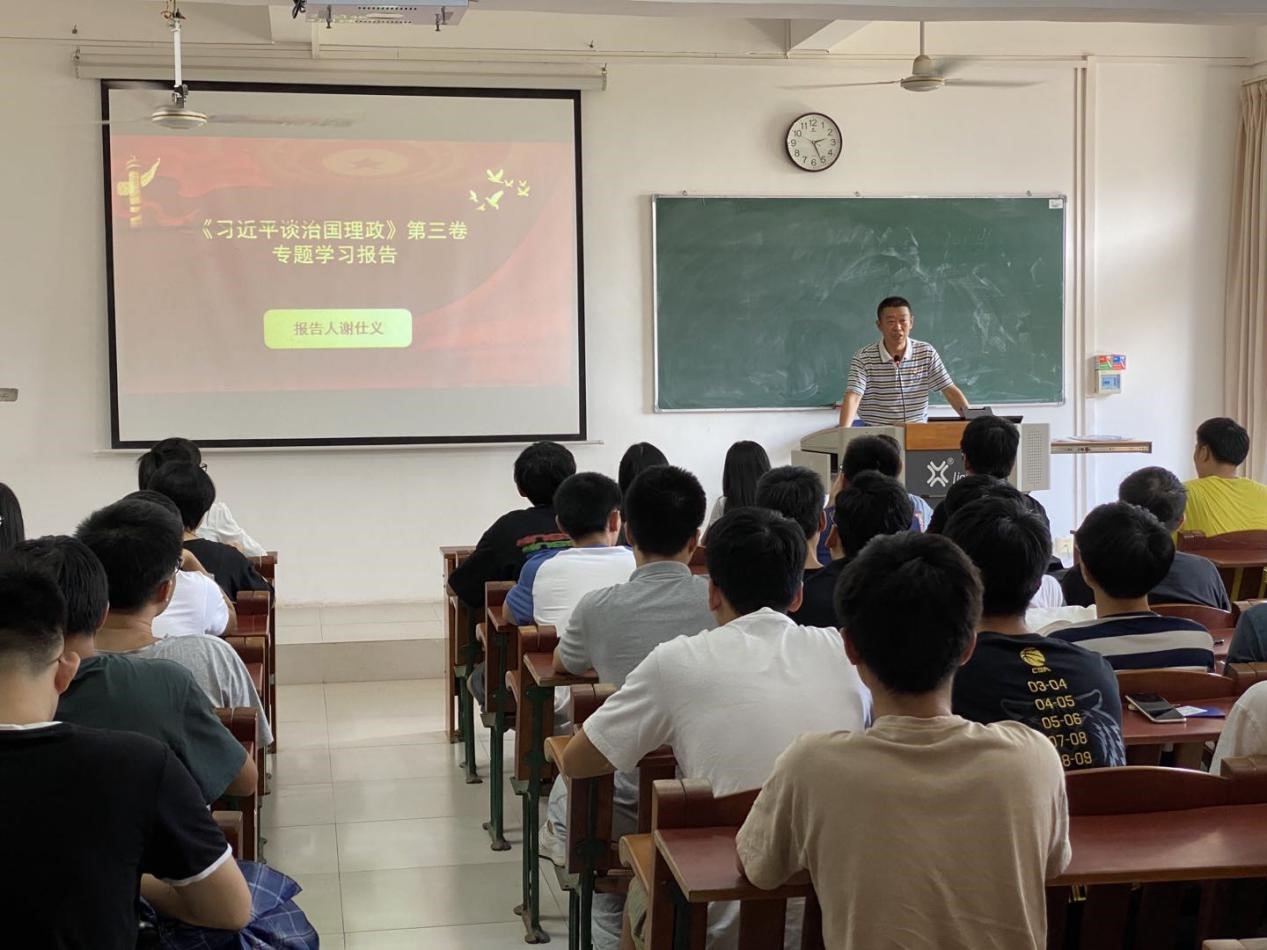 党委书记谢仕义教授从《习近平谈治国理政》第三卷出版的重大意义、主要内容和如何学习贯彻落实书中习近平新时代中国特色社会主义思想等三方面,为学生讲授了一堂生动的思政课。他号召全体学生大力弘扬理论联系实际的优良学风,学深悟透《习近平谈治国理政》第三卷,呼吁学生务必了解历史,不要崇洋媚外,坚持道路、文化、理论、制度自信,一切从实际出发,不忘初心,牢记使命。同时对学生提出三个要求:一要真情实感读原著;二要真心实意学原文;三要真下功夫悟原理。告诉学生应反复阅读这部重要著作,要做到“知其然更知其所以然”。